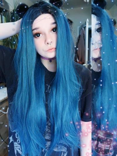 Sea blue colors with black root color long synthetic wig, glueless lace front cap construction